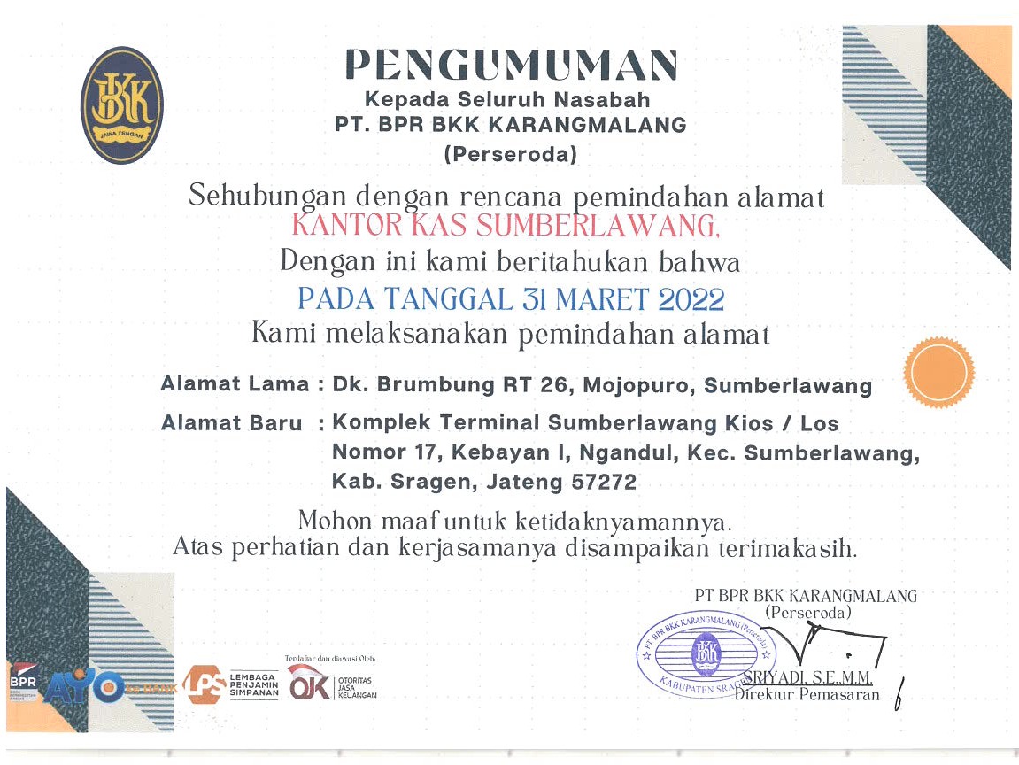 Pengumuman pindah Kantor Kas Sumberlawang PT. BPR BKK Karangmalang