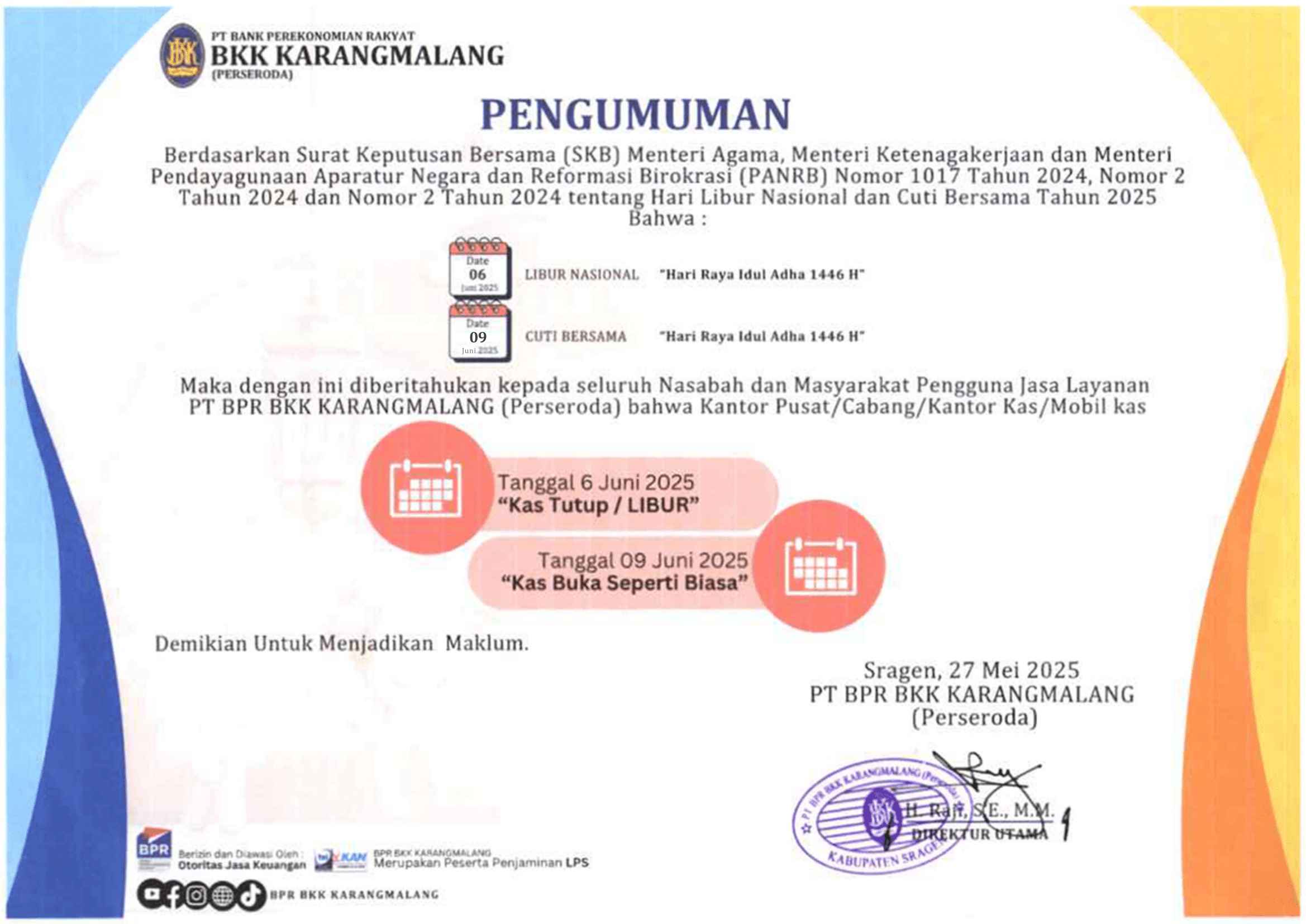 Grobogan, 25 Juni 2025 – PT BPR BKK Karangmalang (Perseroda) dan Kejaksaan Negeri Grobogan secara resmi menandatangani Nota Kesepahaman (MoU)